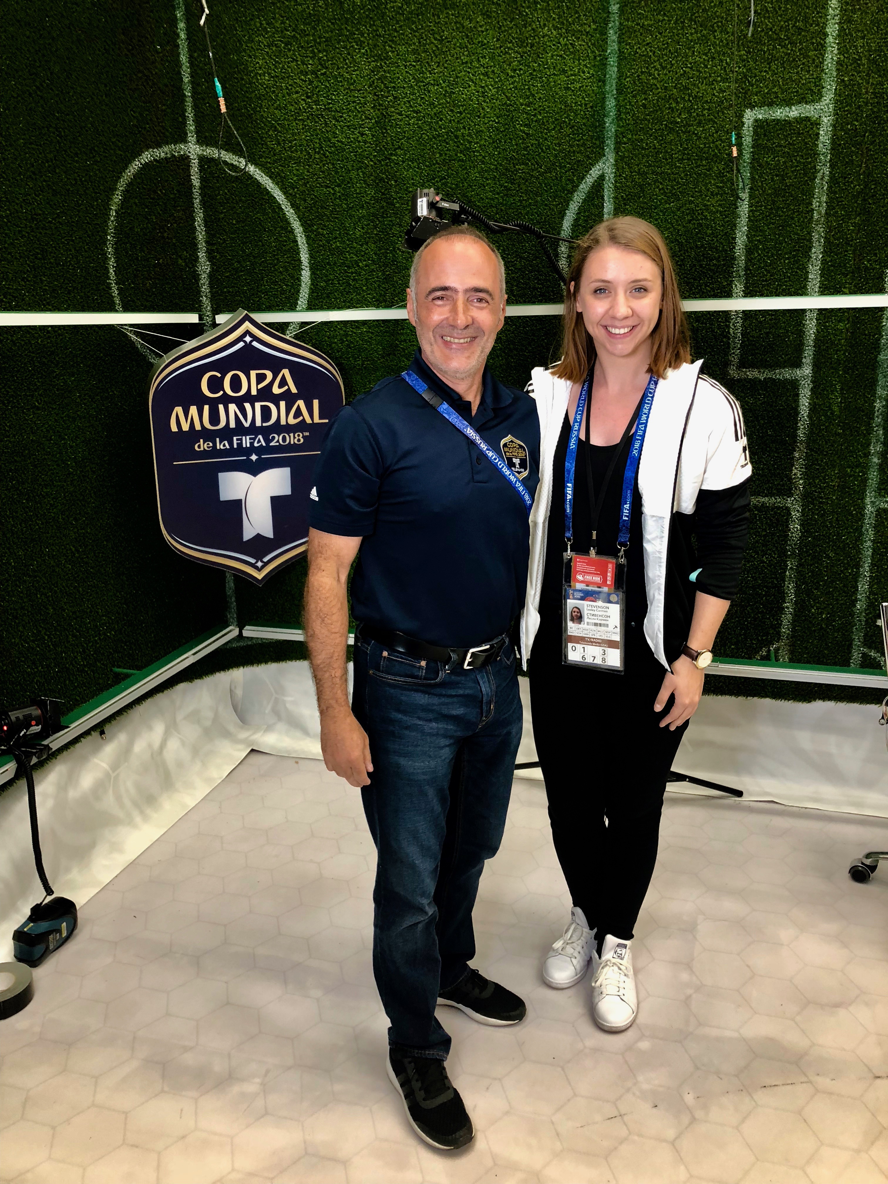 Standing on the Telemundo Copa Mundial set as the team begins strike. I visited the International Broadcast Center (IBC) to meet in person all the teams I had been working with over email and phone. Aldo, pictured here, managed FIFA accreditation, while I oversaw FIFA spectator credentials (FAN IDs). We made a great team!